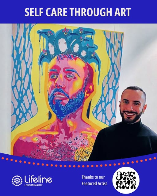 🎨 SELF CARE THROUGH ART 🖌✨ Are you taking time out to do the things you love? “My art is centered around a character I call Creatur, reflecting my journey of self-expression. Each artwork builds a universe beyond the everyday world. A space to step out, release my ideas and emotions. In that release, joy comes alive.” – Daniel Muscat (CREATUR) The artwork featured here is a self-portrait, showing Currawongs crowning Daniel. He uses the symbolism of a crown of birds throughout his work to highlight freedom, thought, and rebirth. Daniel is a Sydney-based artist whose character-driven practice explores themes of self-expression and renewal, creating imaginative new worlds as a way to process and release emotions. He will be one of the artists featured in our upcoming Hold the Line Art Fundraiser Exhibition. 💙 Creative outlets like art, music, and lettering can: ✔ Relieve stress ✔ Boost self-expression ✔ Support mental wellbeing Remember, your self-care might look different—maybe it’s reaching out for support. 📞 Call Lifeline anytime on 13 11 14 💬 Or text us 24/7 on 0477 13 11 14 You’re never alone. 💜 #volunteers #community #selfcare #bendigoart #holdtheline @creaturisticart (fb)