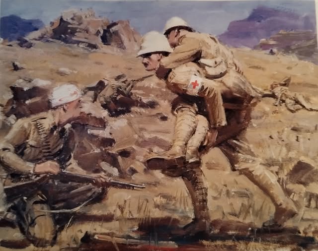 William Dargie’s 1960s interpretation of Lieutenant Neville Howse of the New South Wales Medical Corps performing the action which earned him the Victoria Cross at Vredefort, South Africa, on 24 July 1900. [AWM ART29246] (fb)