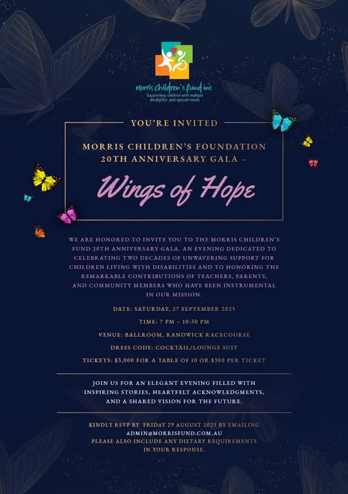 "WINGS OF HOPE" This year, the Morris Children's Fund Inc (MCF) which was established in 2005, celebrates its 20th anniversary. We will formally celebrate on September 27th 2025 with a gala ball at the Randwick Racecourse Function Centre with the theme "Wings of Hope". We would love you to be there. Your invitation is attached. (fb)