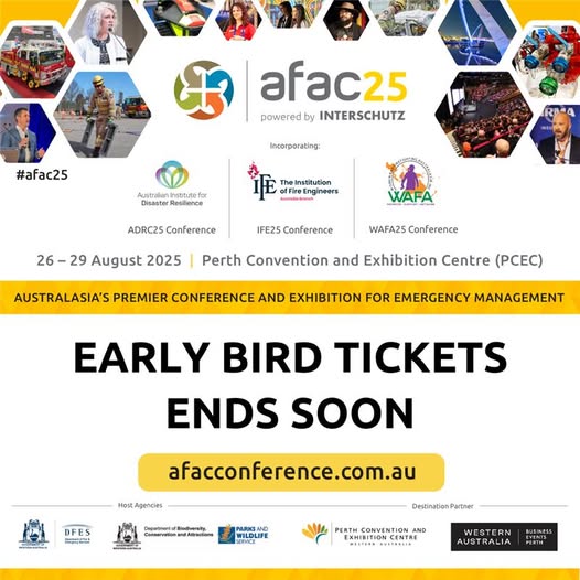 Time is running out to grab your early bird tickets for AFAC25 powered by INTERSCHUTZ, returning to Perth from 26–29 August. Register here: https://www.afacconference.com.au/2025-pricing-registration Don’t miss your chance to join thousands of emergency management and firefighting professionals at Australasia’s largest and most comprehensive event. Early bird registrations close on 30 June. Register today to secure your place at #AFAC25. (fb)