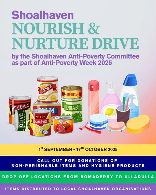 As part of Anti-Poverty Week 2025, the Shoalhaven Anti-Poverty Committee is running the Shoalhaven Nourish & Nurture Drive from 1 September 2025 to 17 October 2025. What can you donate? Non-Perishable Items*: - Cereal - Long Life Milk - Biscuits - Tea/Coffee - Pasta - Pasta Sauce - Muesli Bars/Snacks - Tinned Food (Vegetables, Soup) - Tinned Food (spaghetti, baked beans) *Please donate non-perishable items that are in date Hygiene Items: - Deodorant - Sanitary Products - Hair Brush/comb - Tissues/Toilet Paper - Body Wash/Soap - Sanitiser - Razors - Toothpaste/Toothbrush - Shampoo/Conditioner Drop off locations are as follows: - Southern Cross Housing: 69 Kinghorne Street, Nowra - headspace Nowra: 96 Kinghorne Street, Nowra - Shoalhaven Neighbourhood Services: 41 Worrigee Street, Nowra & 2/80 Park Road, Nowra - South Coast & Country Community Law: 80 Bridge Road, Nowra - NSW TAFE: Ground floor, 60 Beinda St, Bomaderry (A Block) - Ulladulla & Districts Community Resource Centre: 78 St Vincent Street, Ulladulla Thank you for supporting those in need in our community. (fb)