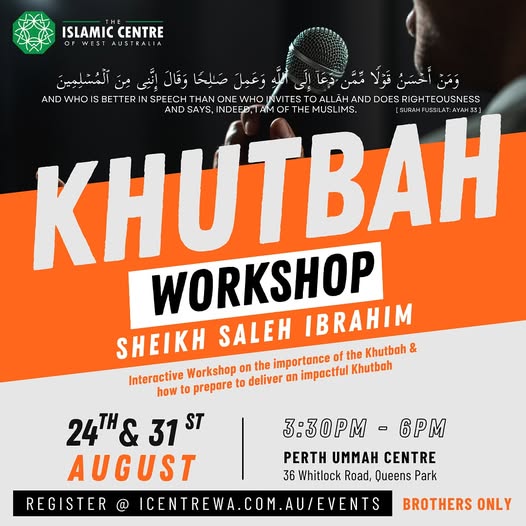 Learn. Prepare. Deliver. An interactive 2-day workshop focused on the importance of the Khutbah and how to deliver it with confidence and impact. Day 1: 📘 Theory-based learning 🧭 Understanding the structure of a Khutbah 🛠️ How to prepare and write a meaningful Khutbah Day 2: 🎙️ Practical training ✍️ Prepare your own Khutbah 🗣️ Deliver it to the group with live feedback Delivered by: Sheikh Saleh Ibrahim Note: Applicants must meet eligibility criteria. 💻 Register your interest now via the Expression of Interest form on our website. www.icentrewa.com.au/classes Link in bio (fb)