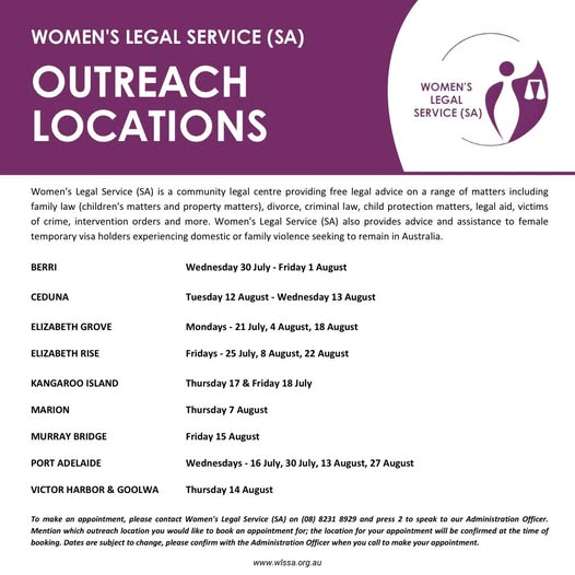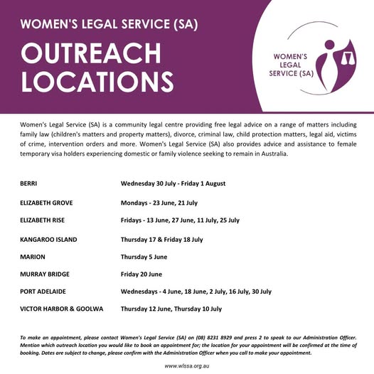 UPCOMING OUTREACH: Staff of @womenslegalservicesa will be at the following locations for Outreach appointments. If you, or someone you know, lives in one of these areas and would like to make an appointment, please call us on (08) 8231 8929 and press 2 to speak to an Admin officer. Mention which outreach location you’d like to make your appointment for. #womenslegalservicesa #legalservicessa #communitylegalservices #communitylegalcentre #communityoutreach #accesstojustice #outreach (fb)