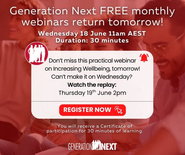 🚨 Just one day to go 🚨 Our highly anticipated return is almost here! Join Andrew Fuller for our free webinar on Increasing Wellbeing, tomorrow Wednesday 18 June 11am AEST. Registration is free! https://www.generationnext.com.au/webcasthome/?utm_source=socials-daybefore 🎥 Can’t make it on Wednesday? A replay will be available Thursday 19 June at 2pm! Don’t miss this opportunity to learn from one of the best minds in mental health for young people. 👉 Register now & spread the word! #WellbeingWebinar #youngpeoplesmentalhealth #wellbeingeducation #mentalhealthsupport #wellbeingsupport #mentalhealth (fb)