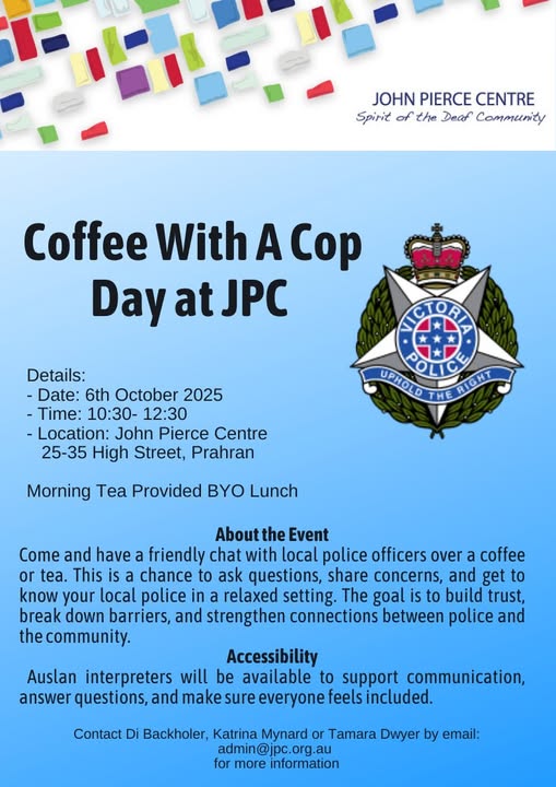 Join us at JPC for a relaxed and casual chat and a cuppa with the local Police Victoria members. (fb)
