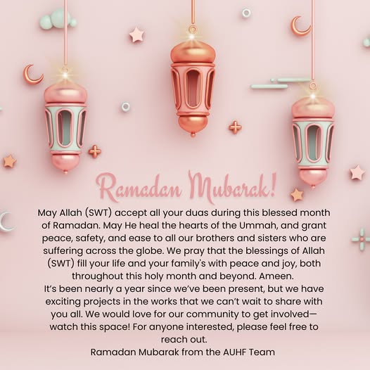 May Allah (SWT) accept all your duas during this blessed month of Ramadan. May He heal the hearts of the Ummah, and grant peace, safety, and ease to all our brothers and sisters who are suffering across the globe. We pray that the blessings of Allah (SWT) fill your life and your family's with peace and joy, both throughout this holy month and beyond. Ameen. 🤲🏻 It’s been nearly a year since we’ve been present, but we have exciting projects in the works that we can’t wait to share with you all. We would love for our community to get involved—watch this space! For anyone interested, please feel free to reach out. Ramadan Mubarak from the AUHF Team ❤️ (fb)