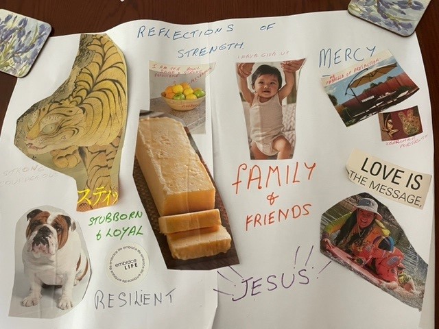 we have just finished a program called "A reflective journey of hope" based on collage therapy. Those who attended, found it to be very encouraging about who they are, what were their strengths and hopes for the future. Ken and Ros also took part and were surprised at the insights in their own lives. below is one of Ros's. perhaps you can guess how she sees herself. (fb)