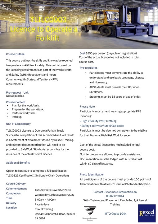 Forklift Licence - Upcoming course (only a couple spaces left) - Kilburn, South Australia - Dates: Tuesday 14th - Wednesday 15th November 2023 Call our office today to book your spot (08) 8212 7844 (fb)
