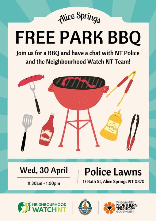 ALICE SPRINGS - Join us for a BBQ in the park tomorrow! 📅 Wednesday, 30th April, 11:30am - 1:00pm 📍 Police Lawns, 17 Bath St, Alice Springs Come down and have a chat with NT Police and the Neighbourhood Watch NT Team! (fb)