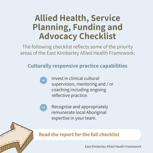 Recently, we launched the East Kimberley Allied Health Framework — a practical new resource to guide workforce development and investment in allied health across our region. The Framework includes a helpful checklist of actions to help organisations improve access to allied health care, grow the local workforce, and contribute to a stronger, more sustainable system. Whether you’re in health, education, community services or policy — this tool can support your planning and decision-making. ✅ Explore the checklist and download the full Framework: 🔗 https://hubs.li/Q03mpV5y0 (fb)