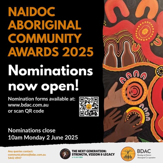 ❤️💛 🖤 NOMINATIONS NOW OPEN 💙💚🤍🖤 2025 BDAC NAIDOC ABORIGINAL COMMUNITY AWARDS! Do you know an Aboriginal and/or Torres Strait Islander young person or adult who’s making a real impact in our Community? Whether they’re caring for Culture and Country, being a leader and role model, making a positive contribution to Community, excelling in sport, or doing great things in school or work – now’s your chance to recognise them! Nominations forms are available at www.bdac.com.au or scan the QR code below And if you have any questions, or need help with the form, contact Karly at communications@bdac.com.au or 0459 412 057 (fb)