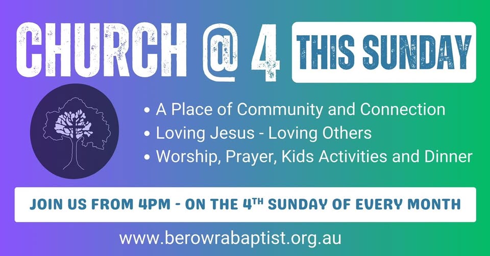 Berowra Baptist Church Please join us this Easter Welcome Home We are a community of people who usually gather together on Sundays to share life worship Jesus drink coffee pray together and learn from the Bible. We are a come as you are bunch and have the same desire for our guests. Our main gathering is Sunday starting at 930am for coffeetea with the service starting at 10am. We also have a brand new service on the first Sunday of the month at 4pm.