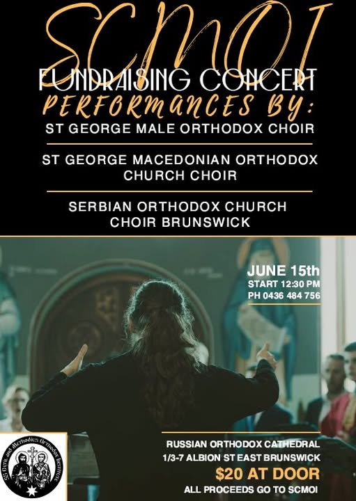 Join us for an afternoon of choral hymns at Prokrov Russian Orthodox Cathedral, East Brunswick on June the 15th. There will be performances by St George Male Orthodox Choir, St George Macedonian Orthodox Church Choir and the Serbian Orthodox Church Choir Brunswick. $20 entry and all proceeds go to SCMOI. Please see flyer for more information. (fb)