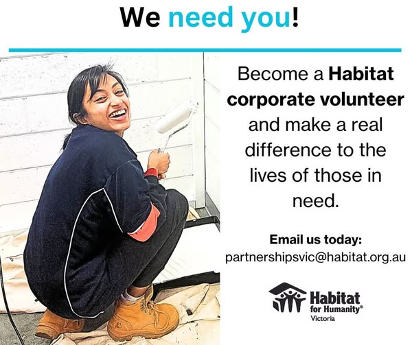 Learn new skills, have fun and experience the satisfaction of helping improve the lives of others by joining us for a corporate volunteer day! 💪 🩵 Our Volunteer Programs Coordinator David Bryce would love to hear from you. To find out more, please email partnershipsvic@habitat.org.au. (fb)