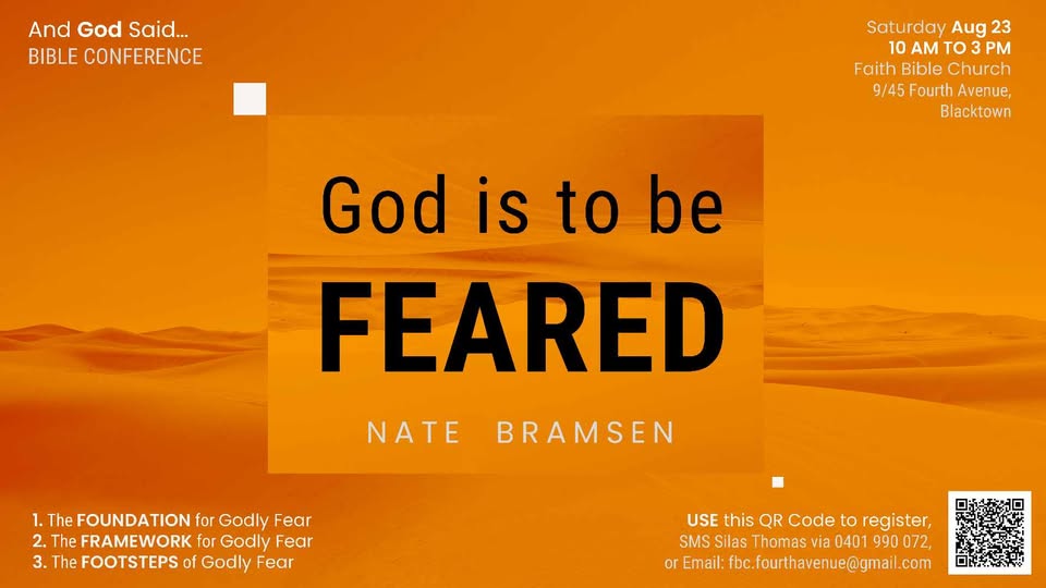 The next And God Said Conference is on this Saturday at Faith Bible Church. Nate Bramsen will be taking us through the topic "God is to be feared." To register your interest please follow this link: https://zfrmz.com.au/PjzFGY0PK2eJbetuDLGm (fb)