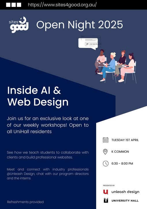 Curious about Web Design or AI? Join us for an Open Workshop Night at Sites4Good! 🔹 What’s happening? Drop in and see how we build websites for charities Learn about web design and AI Chat with our team and get hands-on experience 📅 Date: 1st April 2025 📍 Location: K Common ⏰ Time: 6:30 -8:00 PM No sign-ups needed—just show up and explore. Whether you're into coding, design, or just curious, this is your chance to see what we do at Sites4Good and how you can get involved. Hope to see you there! #Sites4Good #WebDesign #AI #StudentWorkshop #OpenNight (fb)