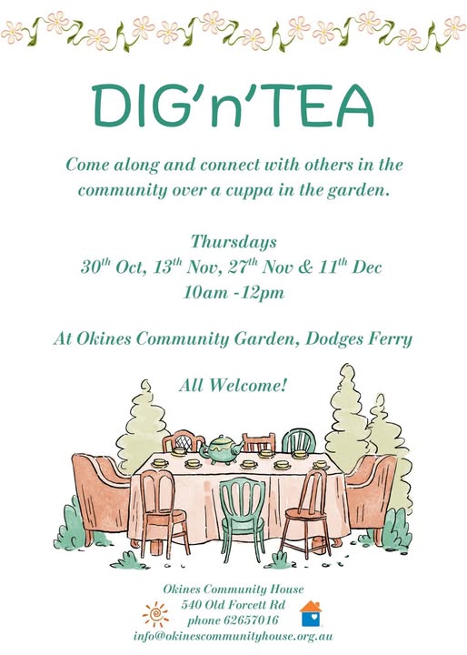 Although we won’t be running our usual DIGnity sessions for the time being, we will be running DIG’n’TEA in the Okines Community House Garden. If you would like to have a relaxed cuppa in the ambience of the garden with old and new friends, we would love you to join us. (fb)