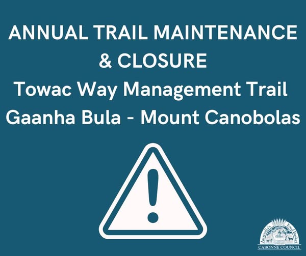 ANNUAL TRAIL MAINTENANCE & CLOSURE | Towac Way Management Trail The National Parks & Wildlife Service will be carrying out annual maintenance on the Towac Way Management Trail in Gaanha Bula - Mount Canobolas State Conservation Area. Works include: • Heavy plant work • Re-gravelling of Towac Way and connecting management trails Closure period: Monday, 16 June – Friday, 20 June 2025 For public safety, Towac Way and all connecting management trails will be closed during this time. Orange360 Orange Visitor Centre (fb)