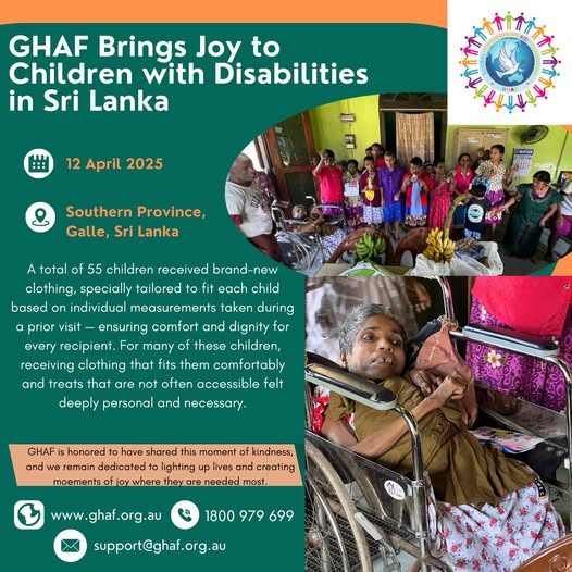 GHAF Brings Joy to Children with Disabilities in Sri Lanka On the 12th of April 2025, the Global Humanitarian Aid Foundation (GHAF) carried out a compassionate outreach initiative in Galle, Southern Province, Sri Lanka. In the spirit of the upcoming Sinhala and Tamil New Year, GHAF extended meaningful support to a local children’s home for children with disabilities by distributing essential and thoughtfully selected items. A total of 55 children received brand-new clothing, specially tailored to fit each child based on individual measurements taken during a prior visit — ensuring comfort and dignity for every recipient. Alongside the clothing, GHAF also provided cake, bananas, chocolate, biscuits, toys, and purses — bringing joy and celebration to children who rarely have access to such treats. For many of these children, receiving clothing that fits them comfortably and treats that are not often accessible felt deeply personal and necessary. This initiative was more than just a distribution of goods; it was an act of love, care, and genuine connection. The children’s smiles and excitement were a powerful reminder of the impact that thoughtful, compassionate support can have on their lives. GHAF is proud to continue its mission of uplifting and supporting vulnerable communities, especially children with disabilities, through acts of compassion and meaningful impact. We remain dedicated to lighting up lives and creating moments of joy where they are needed most. . . . GHAF is a Not-for-Profit Organisation, ACNC Registered Charity, and NDIS provider offering leading experience in the assessment and treatment of helping people with disabilities to gain independence, increase mobility and improve their well-being. . . . Contact Us 1800 979 699 support@ghaf.org.au www.ghaf.org.au 229 Broadway Reservoir VIC 3073 . . . #SocialImpact #TogetherForChange #DoGoodFeelGood #SupportLocalCommunities #DonateNow #CharityWork #HumanitarianAid #NonProfit #SupportTheCause #ActOfKindness #MakeADifference #GivingBack (fb)