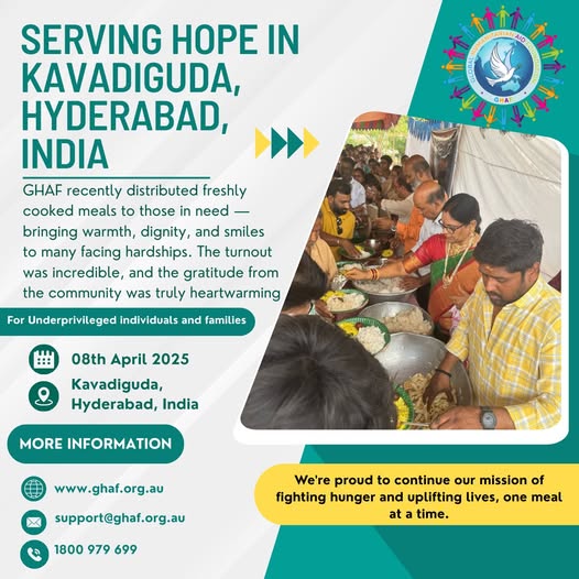 Serving Hope in Kavadiguda, Hyderabad, India On 8th March 2025, the Global Humanitarian Aid Foundation (GHAF) organized a compassionate outreach event in Kavadiguda, a locality in Hyderabad, India, to support underprivileged individuals and families in the area. As part of GHAF’s ongoing efforts to fight hunger and uplift vulnerable communities, freshly prepared cooked meals were distributed to those in need. The event saw a strong turnout, with many individuals attending to receive a warm meal served with dignity and care. The response was overwhelmingly positive — attendees expressed their gratitude, and the joy on their faces reflected the importance of such initiatives. The event created a moment of relief and happiness for those who often struggle to access basic necessities. GHAF remains committed to serving those in need and continuing its mission of spreading kindness and hope through humanitarian action. GHAF is a Not-for-Profit Organisation, ACNC Registered Charity, and NDIS provider offering leading experience in the assessment and treatment of helping people with disabilities to gain independence, increase mobility and improve their well-being. . . . Contact Us 1800 979 699 support@ghaf.org.au www.ghaf.org.au 229 Broadway Reservoir VIC 3073 . . #SocialImpact #TogetherForChange #DoGoodFeelGood #SupportLocalCommunities #DonateNow #CharityWork #HumanitarianAid #NonProfit #SupportTheCause #ActOfKindness #MakeADifference #GivingBack (fb)