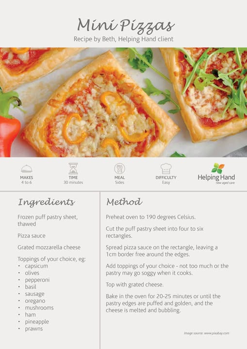 It's Foodie Friday! We're sharing recipes from the Helping Hand community. Today’s recipe is from Beth, a Helping Hand client. -------------------- MINI PIZZAS Ingredients Frozen puff pastry sheet, thawed Pizza sauce Grated mozzarella cheese Toppings of your choice, eg: - capsicum - olives - pepperoni - basil - sausage - oregano - mushrooms - ham - pineapple - prawns Method Preheat oven to 190 degrees Celsius. Cut the puff pastry sheet into four to six rectangles. Spread pizza sauce on the rectangle, leaving a 1cm border free around the edges. Add toppings of your choice - not too much or the pastry may go soggy when it cooks. Top with grated cheese. Bake in the oven for 20-25 minutes or until the pastry edges are puffed and golden, and the cheese is melted and bubbling. #FoodieFriday #HelpingHand #HereForGood #recipes #food #agedcare (fb)