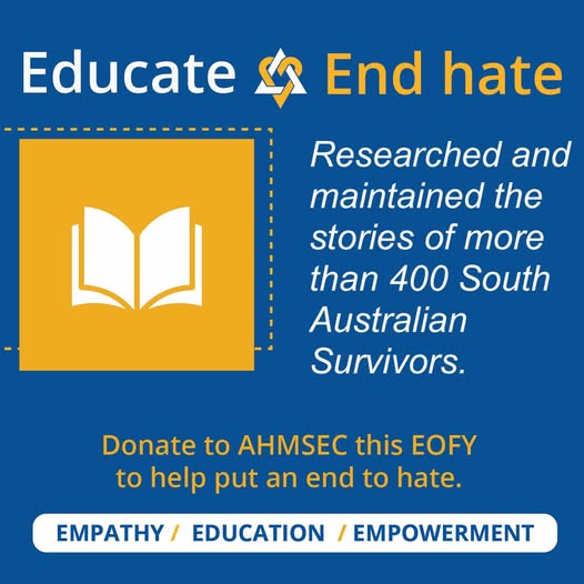 At the Adelaide Holocaust Museum, we’re building more than galleries. We’re building understanding, empathy, and action against hate, starting with recording one survivor's story at a time. You can can help us preserve history, educate young minds, and inspire a more compassionate future. Make a tax deductible donation to help us continue documenting South Australian survivors' stories. 🔗 https://ahmsec.org.au/support/donate/ #EOFYDonation #AdelaideHolocaustMuseum #GiveWithImpact #SupportEducation #StopAntisemitism #StandAgainstHate (fb)