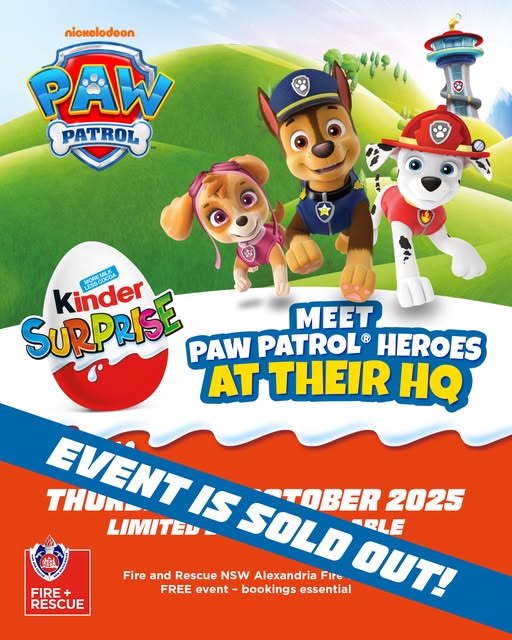 UPDATE-This is event is now sold out. __ This Thursday, 2 October 2025, Fire and Rescue NSW is hosting a pop-up adventure brought to life by Kinder Surprise and inspired by PAW Patrol®. Come along to Alexandria Fire Station to learn about fire safety and teamwork from our very own firefighters, meet Marshall and Skye and explore hands-on rescue zones modelled on PAW Patrol’s big adventures. Every child will receive a Kinder Surprise goodie bag to take home. It’s a one-of-a-kind event your kids won’t want to miss. Free event – bookings essential. Limited spots available. Book here: https://bit.ly/3ImUsiv (fb)