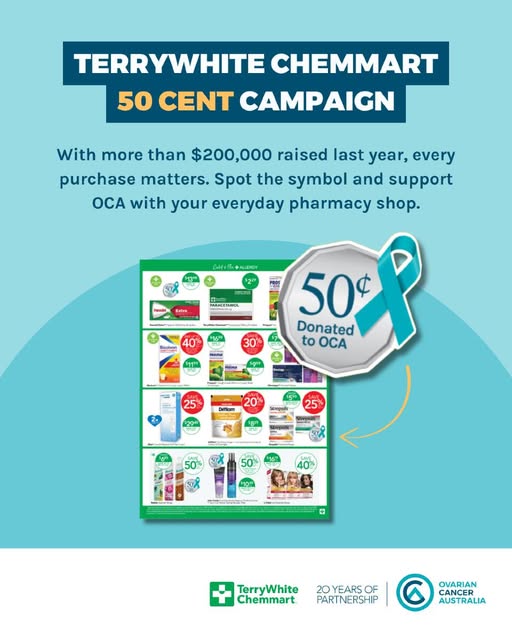 Have you spotted the 50c symbol in your local TerryWhite Chemmart or in their latest catalogue? Every time you choose a participating product, 50c is donated to Ovarian Cancer Australia, helping fund essential support and advocacy services. These small contributions add up to something powerful. Last year alone, this campaign raised over $200,000 to support women and families impacted by ovarian cancer 💙 We’re so grateful to TerryWhite Chemmart and their partner brands for continuing this meaningful initiative and helping ensure no woman with ovarian cancer walks alone. Browse the latest catalogue and look out for the 50c symbol in-store or online: https://terrywhitechemmart.com.au/shop/catalogue (fb)