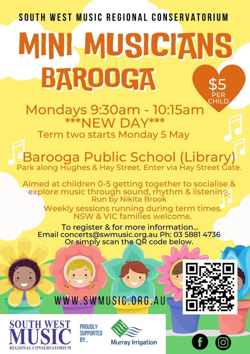 Mini Musicians is back again on Monday in Barooga!! Get ready for a fun-filled session of singing, dancing, and making music together. Perfect for little ones to explore their love of music in a playful and supportive environment! Come join the fun — we can't wait to see you there! Register your interest... https://forms.office.com/r/zuqaCXbrxx (fb)
