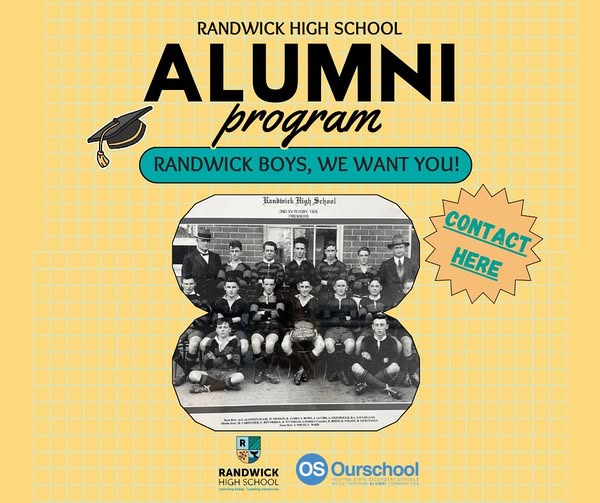 Hello Randwick Boys alumni 👋 We are developing an alumni program at your old school, Randwick Boys High School - now Randwick High School. The program is part of a broader, not-for-profit program called “Ourschool” that helps public high schools build and grow their alumni communities. If you would like to be involved, please email our alumni program coordinator at miriam.hechtman@det.nsw.edu.au. And if you’re not already, follow our Randwick High School Facebook and Instagram pages to stay up to date with what’s happening with the program. We are also now on LinkedIn so please come follow us there and add Randwick High School in your education profile. (fb)