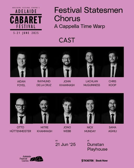 🚨 CAST ANNOUNCEMENT! 🚨 We're so excited to welcome back some FSC old timers for our special SOLD OUT performance of 'A CAPPELLA TIME WARP' at this years Adelaide Cabaret Festival ✨🥳 This will be a special performance with only one person per part!! 😱 Join the wait list for any spare tickets!! 🎉 We'll see ticket holders at the DUNSTAN PLAYHOUSE on the 21st of June at 8pm!! 🔥 Get keen!! (fb)