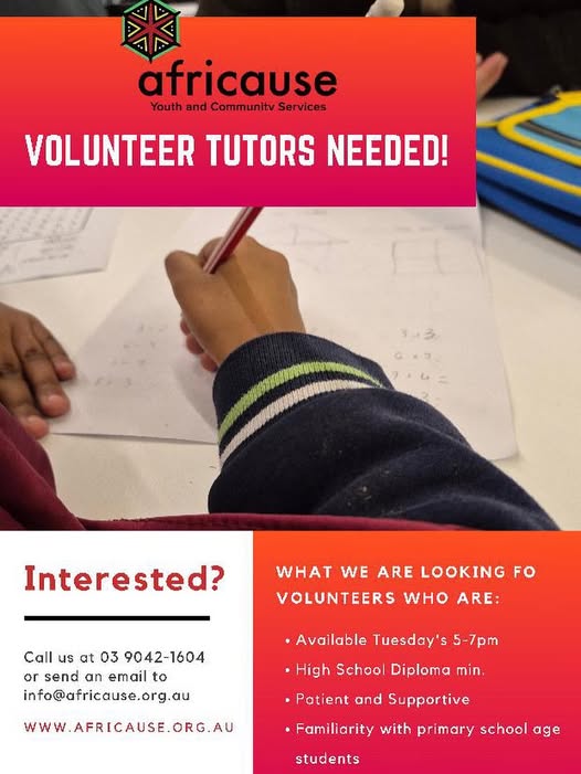 We are searching for dedicated volunteer tutors who can inspire & empower school age students to reach their potential. DM or email us at info@africause.org.au to join our homework club team (fb)
