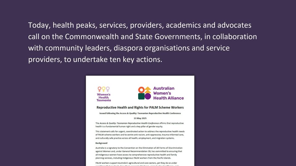 A new joint statement released this week calls for stronger action to uphold the health and rights of people working in Australia through the Pacific Australia Labour Mobility scheme. These are people who contribute to our food systems, care systems and local economies. Too often, they are excluded from essential reproductive healthcare. The statement was launched at the Access & Quality: Tasmanian Reproductive Health Conference, bringing together frontline health workers, advocates and researchers from across Australia. The statement calls for: • Universal contraception and pregnancy care • Protection from reproductive coercion and violence • Culturally safe and language-accessible health services • Better access to care during peak times in regional areas This is about reproductive health. It is also about partnership, safety and care. The conversation continues next month at the Pacific Update in Suva, Fiji. The session Sexual and Reproductive Health and Rights of Pacific Labour Mobility Participants will feature new research and lived experience perspectives. Read the full statement: https://australianwomenshealth.org/2025/05/13/reproductive-health-and-rights-for-palm-scheme-workers/ Downloadable PDF and Word versions: https://australianwomenshealth.org/resource/reproductive-health-and-rights-for-palm-scheme-workers-statement/ Pacific Update details: https://crawford.anu.edu.au/devpolicy/2025-pacific-update Thank you to Women's Health Tasmania for hosting this important gathering and making this national health sector conversation possible. (fb)
