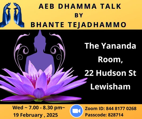 Fantastic News! AEB Dhamma talks & Dana Day resumed!!!! Dhamma Talks/Meditation will start from Wednesday 19th Feb, 2025 and be held every two weeks from 7pm – 8.30pm at The Yananda Room, at the bottom of Luna Apartments at 22 Hudson St, Lewisham (venue will open from 6.30pm and close at 9pm). Our first Dana Day of 2025 will be on Sunday, 23 Feb 2025, 10am - 1pm. For further information, please click on the link https://engagedbuddhists.org.au/2024/12/24/2025-dhamma-teaching-and-dana-day-schedule/ #dhammatalk, #DanaDay, #AEB, #bhanteteja (fb)