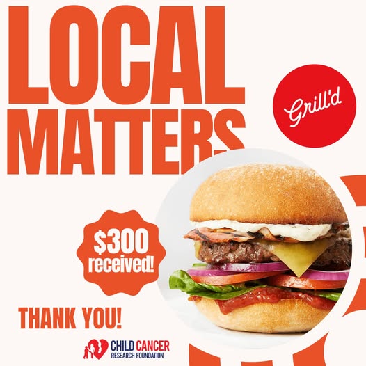 🍔💛 A Big Thank You to Grill’d Innaloo! 💛🍔 We’re excited to share that the Child Cancer Research Foundation has received $300 through Grill'd’s Local Matters community giving program! Every burger purchased and every token placed in our jar helps fund vital research to improve outcomes for children facing cancer. A huge thank you to Grill’d Innaloo and everyone who supported CCRF — your local generosity helps create life-changing impact for kids and families across Western Australia. #CCRF #ChildhoodCancerResearch #GrilldLocalMatters #forourkids #communitysupport (fb)