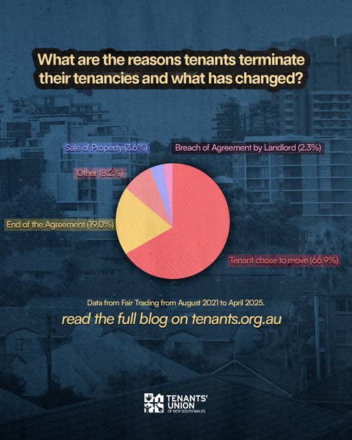 Our Data and Research Coordinator, Jack Moon, and Jennifer Lord took a deep dive into the data from the end of tenancy survey produced by the NSW Government Department of Fair Trading. We recently received an update to the survey data - now spanning from August 2021 to April 2025, allowing us to see what has changed over time. The most common reason tenants terminate their tenancy remains "choosing to move," with more than two-thirds of tenants selecting this option. While this may reflect some tenants' actual circumstances, the survey's legal framework does not permit nuanced responses. For example, a tenant who receives an excessive rent increase and feels forced to leave may still be recorded as "choosing to move". For the full deep dive and look into the data, check out the link to Jack and Jenn's blog post in the comments below. (fb)