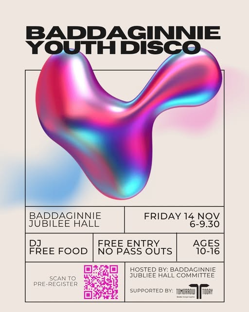 The first Baddaginnie Youth Disc is on soon at the Baddaginnie Jubilee HALL! There will be a DJ and free food. If you are a young person aged 10-16 come along and bring your friends for this fun, free night out! Pre-register here: https://www.surveymonkey.com/r/WF5B27K This event will be fully supervised and security will be present. There will be no pass outs and strictly no smoking/vaping or alcohol. Tomorrow Today is proud to be supporting this event through our Annual Community Grants. This year Baddaginnie Hall Committee successfully applied for a grant to help support social opportunities for local young people. We know the night will be a great success! #tomorrowtoday #tomorrowtodaybenalla #visitbenalla #enjoybenalla #benallayoungpeople #baddaginnie #baddaginniejubileehall #discofever #getyourgrooveon #northeastvictoria #visitbadagginnie #youthdiscobaddaginnie #thingstodobenalla #thingstodobaddaginnie #wots4me #youthbenalla (fb)