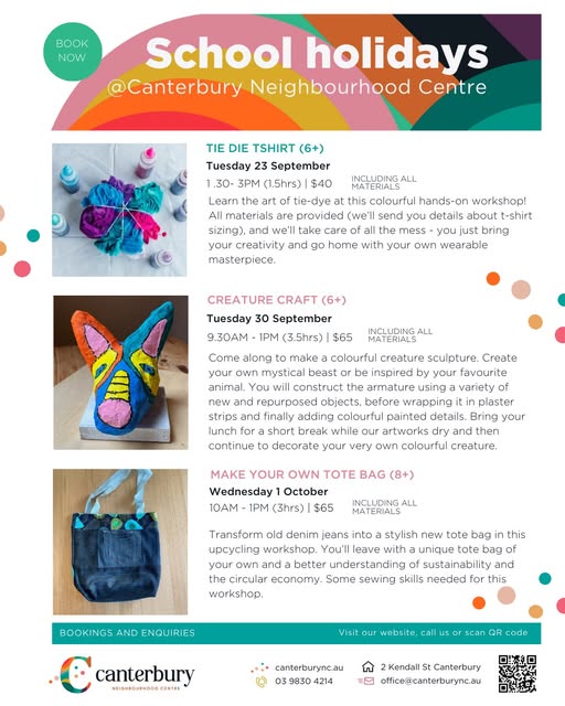 ✨ Which workshop will you choose these holidays? Don’t miss out – spots are limited! 👕 Tie Dye (6+) Tuesday 23 September 1.30–3pm ($30) Learn the art of tie-dye in this colourful, hands-on workshop. All materials (including a t-shirt) provided – take home your very own wearable masterpiece! 🦄 Creative Creatures (6+) Tuesday 30 September 9.30am–1pm ($65) Create your own mystical beast or favourite animal using repurposed objects, plaster, and paint. Bring lunch for a short break while sculptures dry, then add the finishing touches. 🧵 Make Your Own Tote Bag (8+) Wednesday 1 October 10am–1pm ($65) Turn old denim into a stylish tote bag while learning about sustainability and upcycling. Some sewing skills required – leave with a unique bag of your own. Canterbury Neighbourhood Centre, 2 Kendall St, Canterbury More information contact 9830 4214 or email office@canterburync.au canterburync.au #CanterburyNeighbourhoodCentre #SchoolHolidayWorkshops #CreativeKids #Plants #TieDye #UpcycledTote #CraftFun @whatsonboroondara (fb)