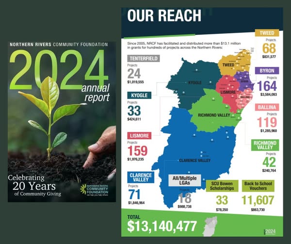 Our latest Annual Report is out! 2024 was a milestone year for NRCF during which we celebrated our 20th year of community giving and more than $13.1 million in total funding distributed across the 7 LGAs that make up the Northern Rivers. Reporting on the 2024 calendar year, this Annual Report captures all the highlights and impact our giving community, funding partners and our grant recipients have helped create. Download a copy here: https://nrcf.org.au/annual-reports/ Thank you to everyone who is part of the giving ecosystem in the Northern Rivers including our donors, supporters, community groups and non-profits. When we come together to create community-led change we all go further. If you’d like to receive a hard copy of the report, drop us a message in the comments and we’ll get a copy in the mail for you. #CommunityFoundation #GiveWhereYouLive (fb)