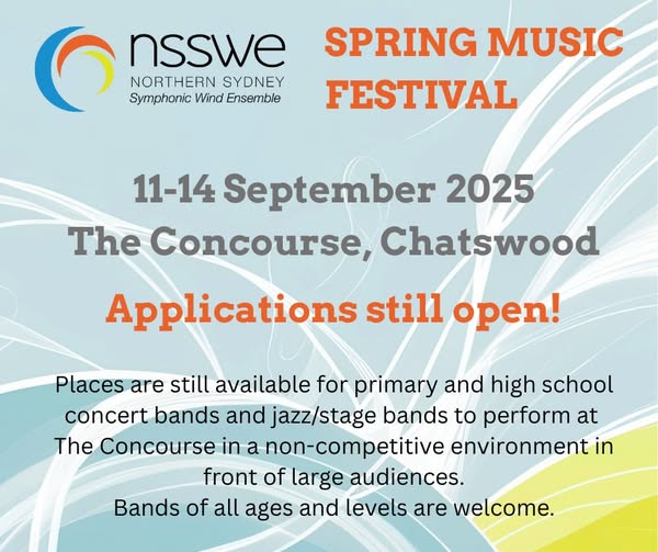 Registrations are still open to perform at the 2025 NSSWE Spring Music Festival! Join us this September at The Concourse, Chatswood for an unforgettable celebration of music, talent and community. The NSSWE Spring Music Festival, a highlight of our calendar, offers young musicians from the Northern Sydney region and beyond the chance to perform non-competitively on a world-class stage before enthusiastic, supportive audiences. From symphonic wind ensembles to jazz bands, senior ensembles to training bands... everyone is welcome! Performance spots are filling fast, so register now to secure your place: https://docs.google.com/forms/d/1RnKr-U37nIwSIiYPVwIuJrBu8VIn5yEMmignUOcTV_s/viewform?edit_requested=true#start=invite (fb)