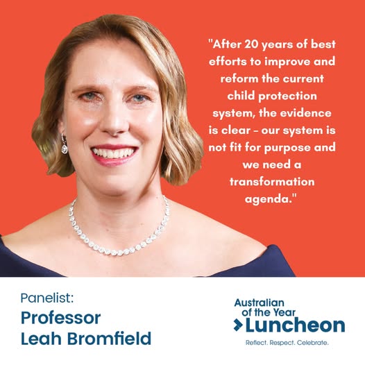 Over two decades, Prof. Leah Bromfield has risen to become one of the most trusted researchers in the child protection field. Her calls for transformation and radical redesign have led to world-first insights and contributed to significant changes in our understanding of, and responses to, child abuse and neglect. She has dedicated her life to developing practical, evidence-based solutions to child abuse and neglect. She shares inspiring ways we can prevent and become more aware of this important but challenging work, where everyone can make a difference in our daily lives. Leah will be speaking more about this at the Australian of the Year Luncheon on Friday, 20 June 2025 at the Adelaide Convention Centre. Places are limited, book your seat today https://bit.ly/AOTYLuncheonNealeDaniherAO Proudly supported by the Australian Government through the National Australia Day Council, the Government of South Australia, Fight MND, Maras Group, Community Bridging Services (CBS) Inc., Adelaide PHN and Accenture #ChildProtectionSystem #AustralianOfTheYearLuncheon #CommunityLeadership (fb)