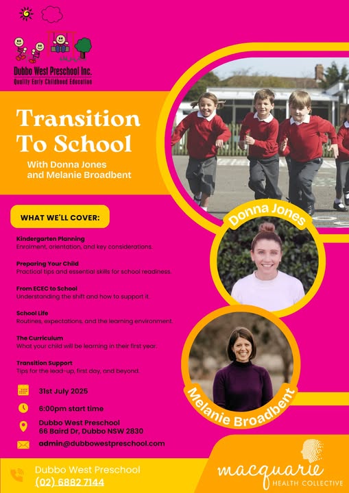 TONIGHT AT PRESCHOOL 6PM START Transition to School Night, Thursday 31st July 6pm at Preschool. If you would like to attend, please call or email the preschool office Email: admin@dubbowestpreschool.com Ph: 02 6882 7144 (fb)