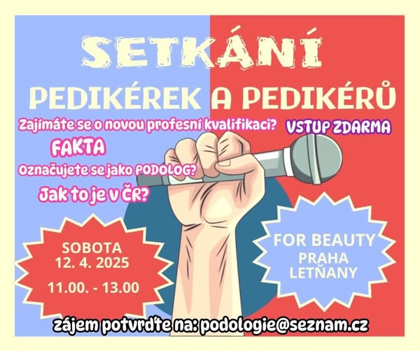 přijďte na kosmetický veletrh FOR BEAUTY, který se koná ve dnech 11. a 12. dubna na výstavišti PVA EXPO PRAHA v Letňanech. Česká podologická společnost se ho tradičně účastní, tak za námi přijďte k našemu stánku.Současně bych Vás chtěl srdečně pozvat na takové setkání pedikérek a pedikérů, které pořádám druhý den veletrhu, tzn. v sobotu 12. dubna, a to od 11 do 13 hodin v konferenčním sále 1, vstupní hala II.Tématem tohoto setkání jsou FAKTA a NE MÝTY J o vznikající profesní kvalifikaci Pedikér se specializací v podologii, o kterých budu mluvit jako navrhovatel kvalifikace a vedoucí pracovní skupiny pro její tvorbu. Hostem bude prof. Petr Arenberger, předseda České dermatovenerologické společnosti a taktéž člen pracovní skupiny.Setkání je určeno výhradně pedikérkám a pedikérům, vstup je ZDARMA a bez ohledu na příslušnost k profesním spolkům. #podolog #podologia #pedicure #pedikura #podology #podologie (fb)