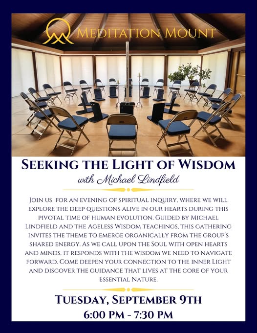 🌟 Evening of Spiritual Inquiry at Meditation Mount 🌟 Join us in the Meditation Mount Auditorium for an evening of spiritual inquiry, where we will “inquire the way together” and seek answers to the deep questions alive in our hearts during this pivotal period of human evolution. ✨ Guided by Michael Lindfield, we’ll draw from the rich reservoir of Ageless Wisdom teachings that form the spiritual foundation of Meditation Mount, along with personal Field Notes filled with lessons learned from walking the Path of Service. This is an organic, interactive gathering where the evening’s theme naturally emerges from the questions and energy of the group. At the heart of this experience is a powerful truth: when we sincerely call upon the Soul with open hearts and minds, it generously responds with the wisdom we need to navigate our path forward. In these times of profound transition—as old structures dissolve and new possibilities emerge—we’re learning to navigate by the Light of the Soul. Come develop your capacity to access the inner wellspring of wisdom that lives at the core of your Essential Nature. 🌀 All are welcome! 📍 Meditation Mount Auditorium 🗓️ September 9th, 2025 | 6:00 pm - 7:30 pm 👉 Register here: https://www.meditationmount.org/event-details-registration/seeking-the-light-of-wisdom-with-michael-lindfield (fb)