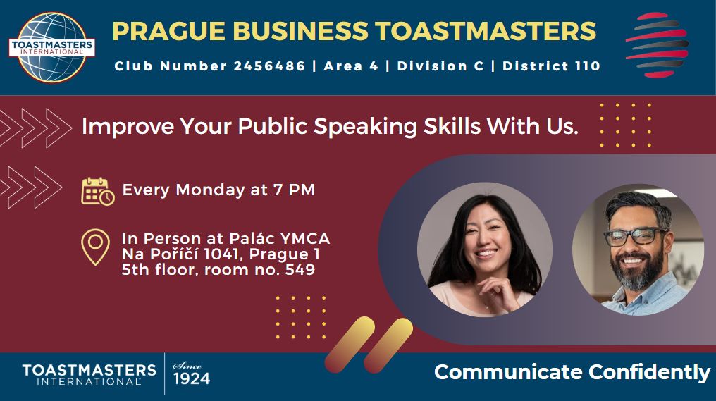 ELEVATE YOUR BUSINESS COMMUNICATION Join Prague Business Toastmasters and explore new ways to improve your public speaking, networking, and leadership skills. Get Tremendous Benefits ENHANCE YOUR LEADERSHIP SKILLS GAIN EXPOSURE TO NEW IDEAS AND PERSPECTIVES Each Meeting is Different Where and When. We meet every Monday at 7 pm in conference room RED VELVET (549) of the Palace YMCA near Namestí Republiky. You can see how to find our meeting room in the video below.