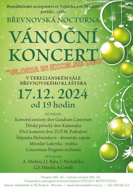 Vážení přátelé, s prvním dnešním sněhem co nejsrdečněji zveme na první koncert v řadě, který připravujeme. Poznačit si můžete tyto termíny: 📌17. 12. 2024 BŘEVNOVSKÝ KLÁŠTER 📌19. 12. 2024 BETLÉMSKÁ KAPLE NA ŽIŽKOVĚ 📌26. 12. 2024 v 15:00 tradiční koncert v ČAKOVICÍCH 📌26. 12. 2024 v 17:00 tradiční koncert ve KBELÍCH 🧐Detaily naleznete vždy aktuálně na www.gaudiumcantorum.cz 🤩Těšíme se na vás! (fb)