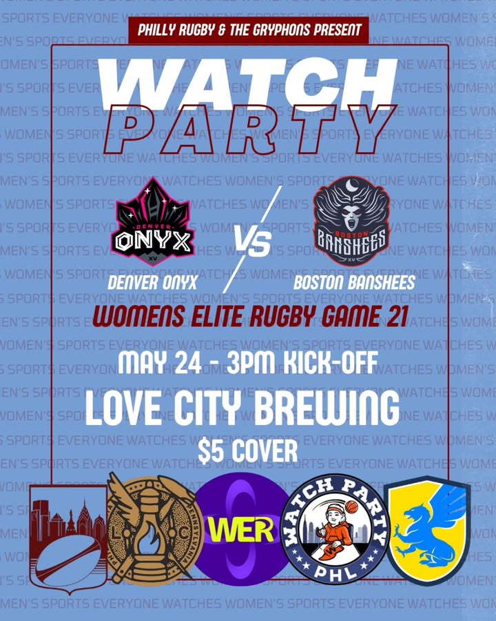 📢 @watchpartyphl @phillygryphons @philadelphiarugby are teaming up Saturday May 24th at the superb @lovecitybrewing to watch Womens Elite Rugby! The Onyx and Banshees will battle it out on the pitch while we all raise funds for @watchpartyphl to open their bar (Philly's First Women's Sports Bar)🥳 There will be a raffle organized by @watchpartyphl and a beer special @lovecitybrewing 🍻🥳 🗓 Saturday May 24th ⏰️ 3:00 KO 🎟 $5 at the door (fb)