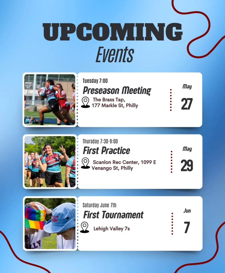 Mark your calendars the 7s season is heating up! See our upcoming events and get involved! 📬 Hit up philly7s@philadelphiarugby.org to get on our mailing list 🔗 Or smash that link in bio to sign up: philadelphiarugby.org/play-7s 📣 Preseason Meeting: May 27 | 7 PM 📍The Brass Tap, 177 Markle St, Philly 🚨 First Practice: May 29 | 7:30–9 PM 📍 Scanlon Rec Center, 1099 E Venango St, Philly 📢 First Tournament 📍Lehigh Valley 7s (fb)