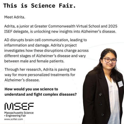 🧠 Adrita’s got brains on the brain! A junior at Greater Commonwealth Virtual School, Adrita is uncovering new insights into Alzheimer’s disease through her original research. This year, she represented Massachusetts as a 2025 ISEF delegate, joining some of the world’s top young scientists at the Regeneron International Science and Engineering Fair. Her work is a powerful reminder of how curiosity and dedication can drive meaningful impact! We can’t wait to see where her scientific journey leads next! 👏🧬 #ThisIsScienceFairThursday #MassScienceFair (fb)