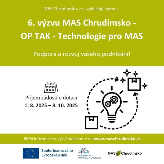 Vyhlašujeme 6. výzvu MAS Chrudimsko - OP TAK - Technologie pro MAS. 🥳 Výzva je zaměřena na podporu a rozvoj podnikání malých a středních podniků v oblasti automatizace, digitalizace a robotizace. 💻📡⚙️🔩 📆Termín přijímání projektových záměrů: 01. 08. 2025 - 08. 10. 2025 💶Celková částka dotace z EU fondů: 3 545 475,26 Kč 💰Míra podpory: 50% ⬇️Minimální výše celkových způsobilých výdajů na projekt: 250 000 Kč ⬆️Maximální výše způsobilých výdajů na projekt: 2 000 000 Kč Rádi s Vámi projektový záměr zkonzultujeme. 📧📞 Podrobné informace naleznete zde: https://maschrudimsko.cz/vyzva/6-vyzva-mas-chrudimsko-op-tak-technologie-pro-mas (fb)
